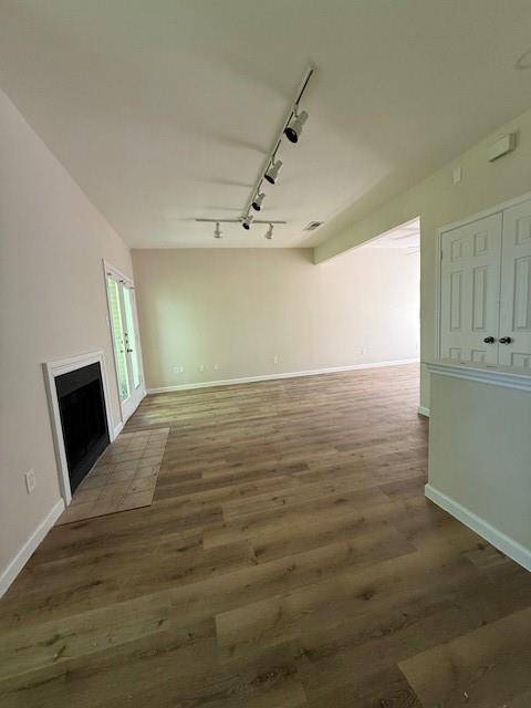 This unit features a spacious open-concept living area with a cozy fireplace, dining area, and a fully equipped modern kitchen with refrigerator, dishwasher, electric range, and microwave. The bedroom offers a walk-in closet and opens to the living space for a loft-like feel.