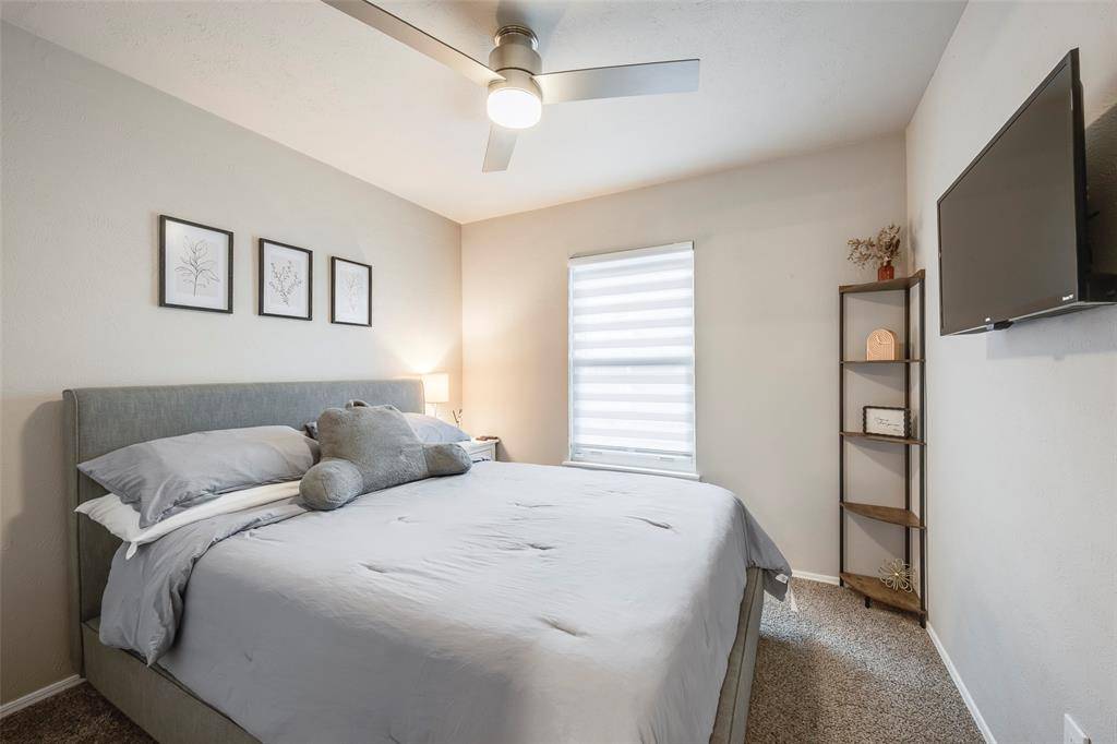 The primary suite offers high ceilings, a sitting area, an en-suite bath with double vanity, granite countertops, soaking tub & shower, and walk-in closet. Two additional bedrooms share an updated full bathroom. Recent upgrades include dry bar off the dining area, LOW-E windows with custom blinds, solar panels with Tesla battery backup, new HVAC (5-2025), upgraded patio with 8-foot privacy fence, pergola lighting, and outdoor grill area. Come tour this amazing home today!