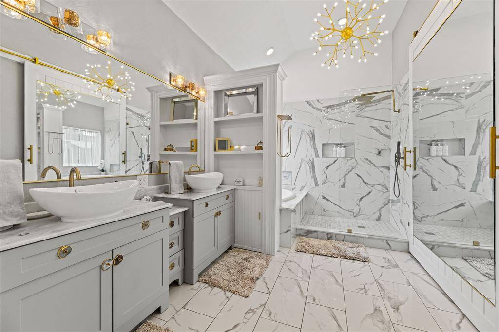Home opens to Hardwood Flooring , Stacked Formals Featuring Crown Molding and Plantation Shutters. Gourmet Kitchen with Hardwood Floors, Walk In Pantry, Breakfast Bar, Built in Oven-Microwave, Wood Blinds. Open to Elegant Family Room with Fireplace. Secluded Master Retreat on First Floor, Overlooking Private Back Yard Oasis. Crown Molding, Designer Lighting, Primary Bathroom with Deluxe Finish Out and Walk in Custom Closet. Double Sinks, Jacuzzi Tub, Separate Steam Shower. Bedroom Two can Be Used As Study, First Floor with Private Full Bathroom, Wood Shutters, Designer Lighting.
