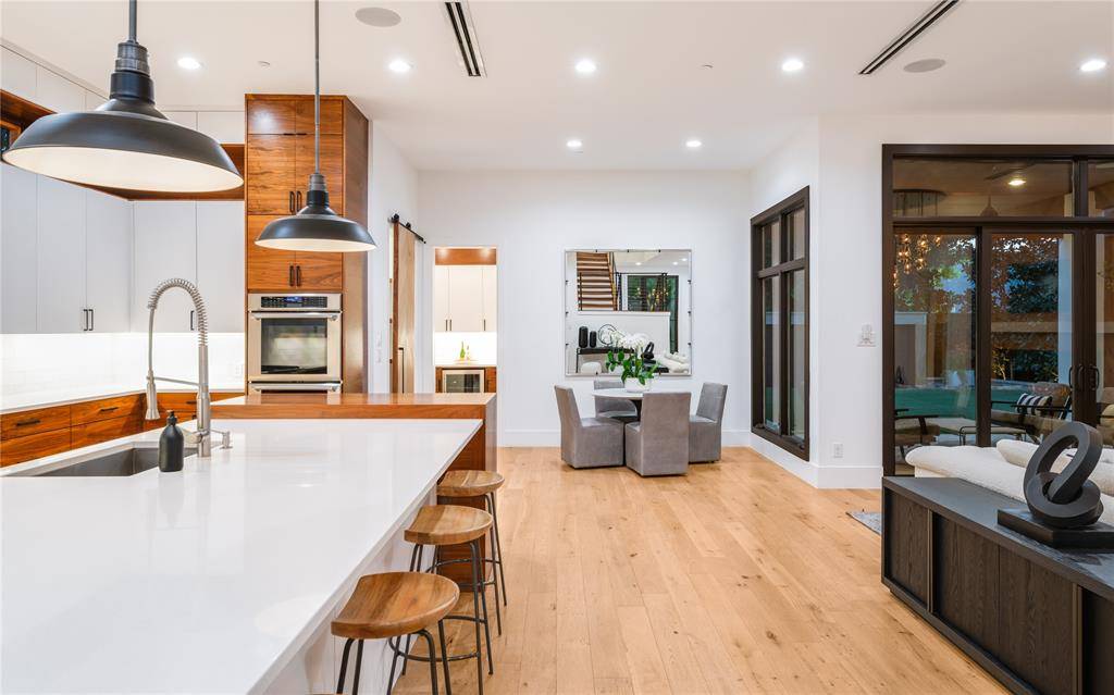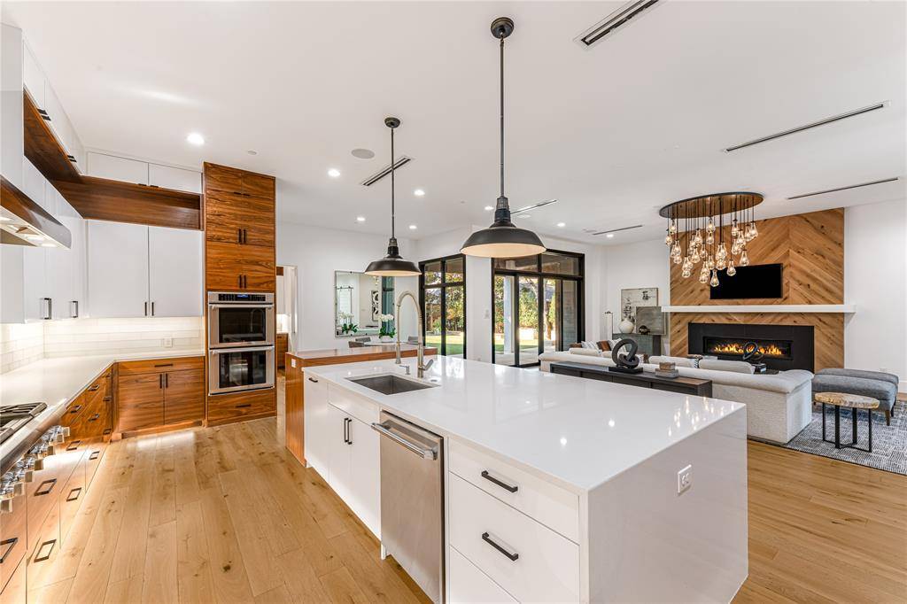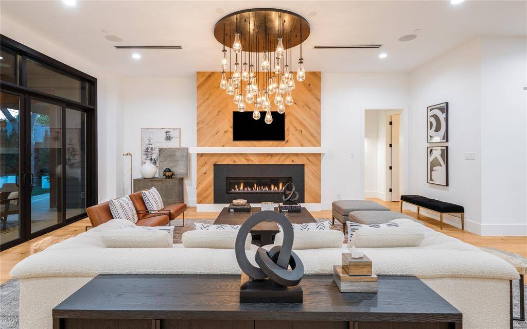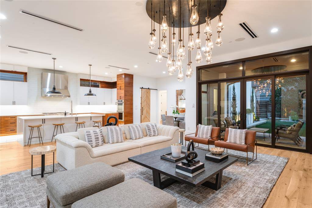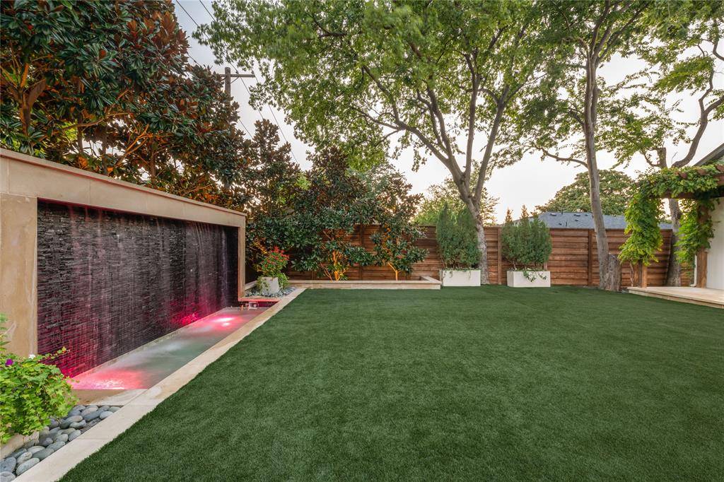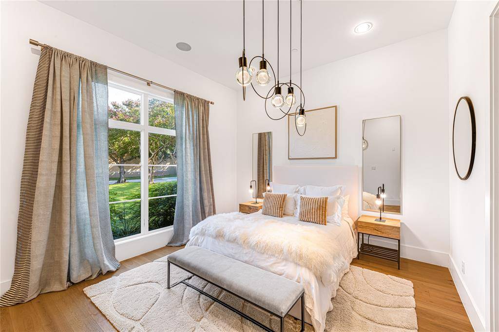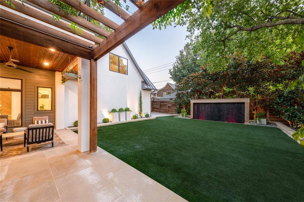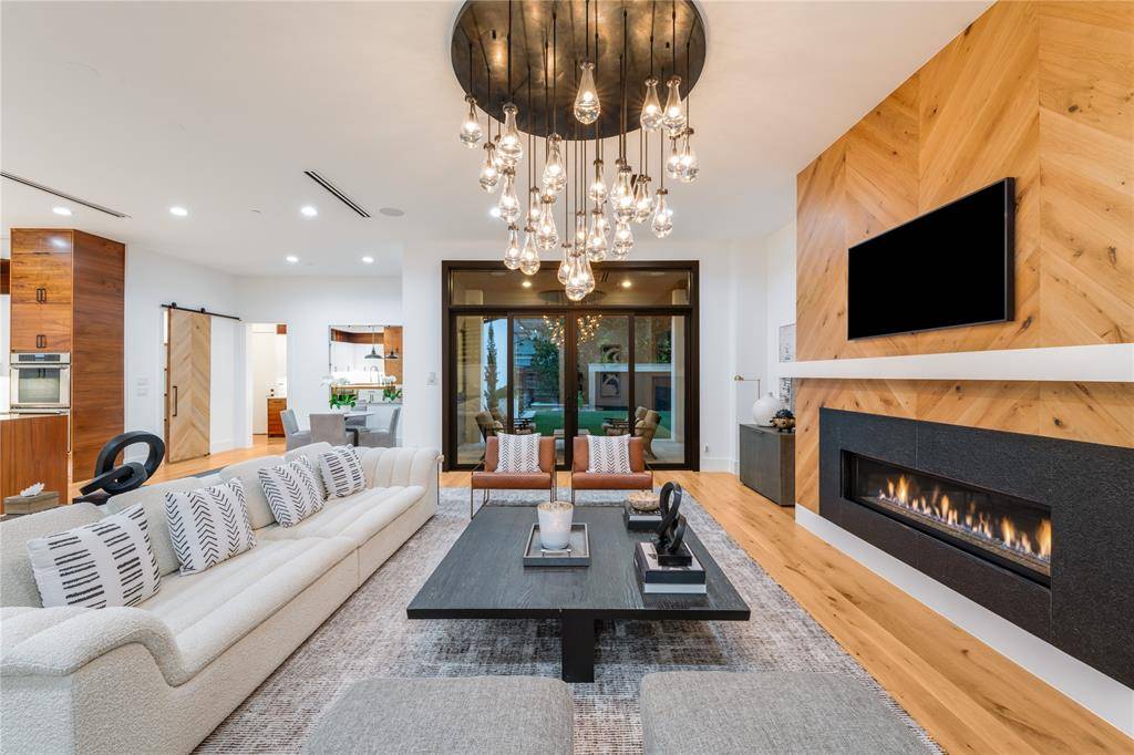 Step into luxury living with this architectural gem on an expansive 70'-wide lot in University Park—tucked behind the wall on a quiet cul-de-sac street, just a short walk to Boone Elementary in HPISD. Custom-built by Anderson Homes, this transitional modern showplace is the ultimate expression of luxury, design and craftsmanship. A dramatic La Cantina glass entry leads to soaring ceilings, natural textures, and sleek architectural lines—flooded with natural light and layered in rich designer detail. Every element is curated: from the 6” white oak floors and Jeld-Wen wood-clad windows and doors to walnut-accented cabinetry, quartz and porcelain tile surfaces and designer lighting. The seamless indoor-outdoor flow elevates both daily living and entertaining. At the heart of the home, the open-concept great room is anchored by a sleek linear fireplace and a dramatic Restoration Hardware chandelier—framed by sliding glass doors that open wide to the terrace and backyard oasis beyond. This intentional indoor-outdoor connection transforms the space, merging relaxed elegance with effortless entertaining. The great room flows into a chef's kitchen–complete with oversized quartz waterfall island, premium Thermador appliances, custom cabinetry, and a sunlit dining area. Also on the main level: a serene primary suite with a spa-worthy bath and boutique-style walk-in closet, a private guest suite, and a dedicated study. Upstairs, three spacious ensuite bedrooms connect to a large game room with wet bar and sliding doors to a covered balcony—an elevated retreat for morning coffee or evening cocktails–and a media room offers the ultimate cinematic experience. The illuminated backyard—designed by Radiant Gardens and Southern Botanical—is a private retreat with a covered terrace and open patio with cedar-shaded arbor, dramatic trickling wall fountain, and a turfed lawn ready for a future pool. Rare in both scale and sophistication, this home defines luxury in the heart of HPISD.
