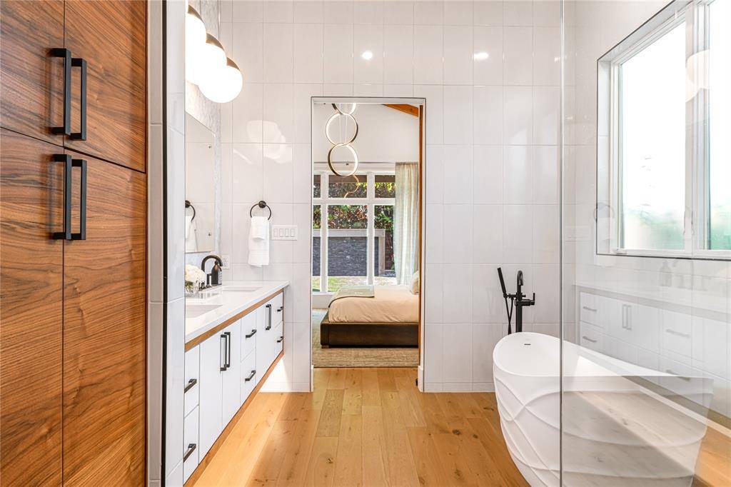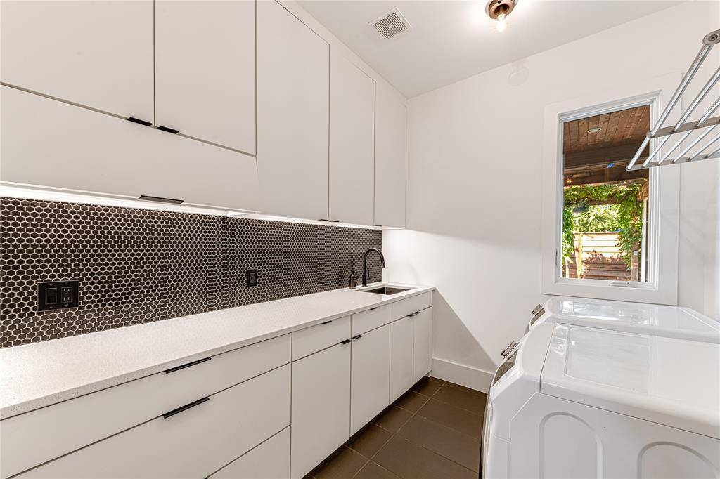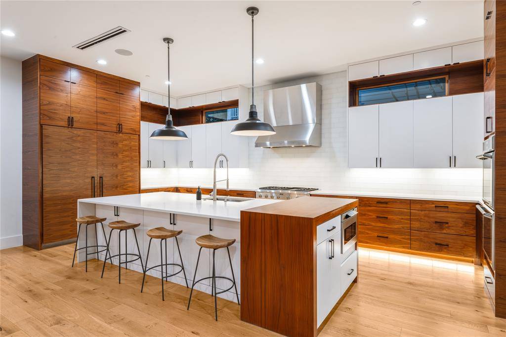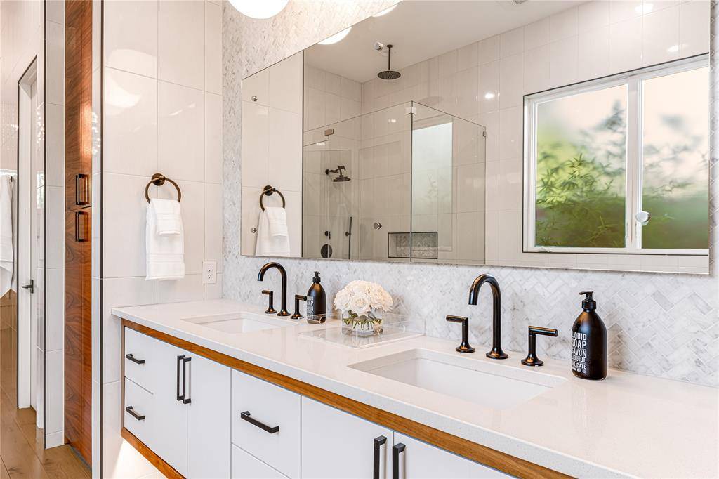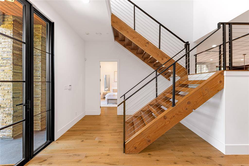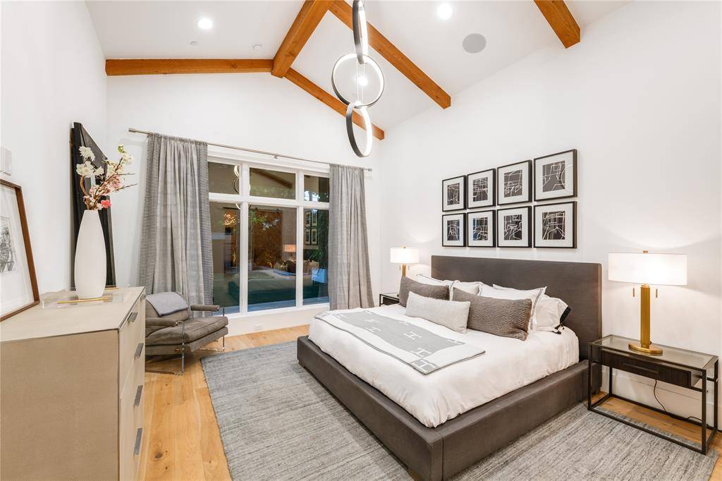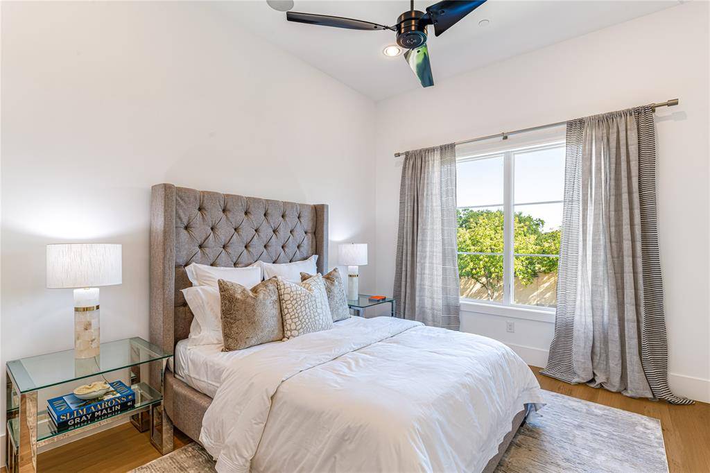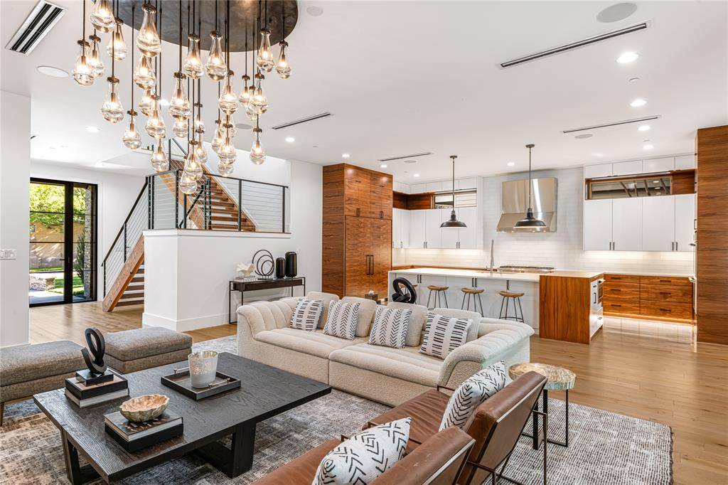 Step into luxury living with this architectural gem on an expansive 70'-wide lot in University Park—tucked behind the wall on a quiet cul-de-sac street, just a short walk to Boone Elementary in HPISD. Custom-built by Anderson Homes, this transitional modern showplace is the ultimate expression of luxury, design and craftsmanship. A dramatic La Cantina glass entry leads to soaring ceilings, natural textures, and sleek architectural lines—flooded with natural light and layered in rich designer detail. Every element is curated: from the 6” white oak floors and Jeld-Wen wood-clad windows and doors to walnut-accented cabinetry, quartz and porcelain tile surfaces and designer lighting. The seamless indoor-outdoor flow elevates both daily living and entertaining. At the heart of the home, the open-concept great room is anchored by a sleek linear fireplace and a dramatic Restoration Hardware chandelier—framed by sliding glass doors that open wide to the terrace and backyard oasis beyond. This intentional indoor-outdoor connection transforms the space, merging relaxed elegance with effortless entertaining. The great room flows into a chef's kitchen–complete with oversized quartz waterfall island, premium Thermador appliances, custom cabinetry, and a sunlit dining area. Also on the main level: a serene primary suite with a spa-worthy bath and boutique-style walk-in closet, a private guest suite, and a dedicated study. Upstairs, three spacious ensuite bedrooms connect to a large game room with wet bar and sliding doors to a covered balcony—an elevated retreat for morning coffee or evening cocktails–and a media room offers the ultimate cinematic experience. The illuminated backyard—designed by Radiant Gardens and Southern Botanical—is a private retreat with a covered terrace and open patio with cedar-shaded arbor, dramatic trickling wall fountain, and a turfed lawn ready for a future pool. Rare in both scale and sophistication, this home defines luxury in the heart of HPISD.
