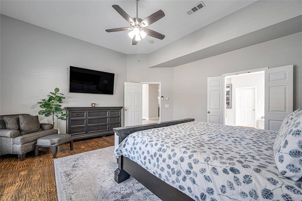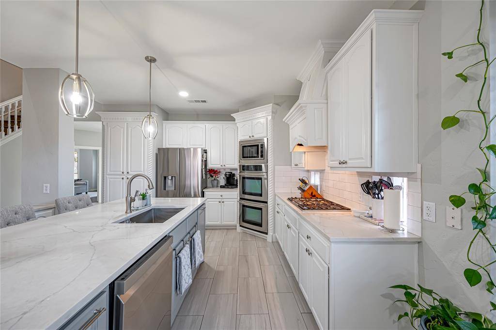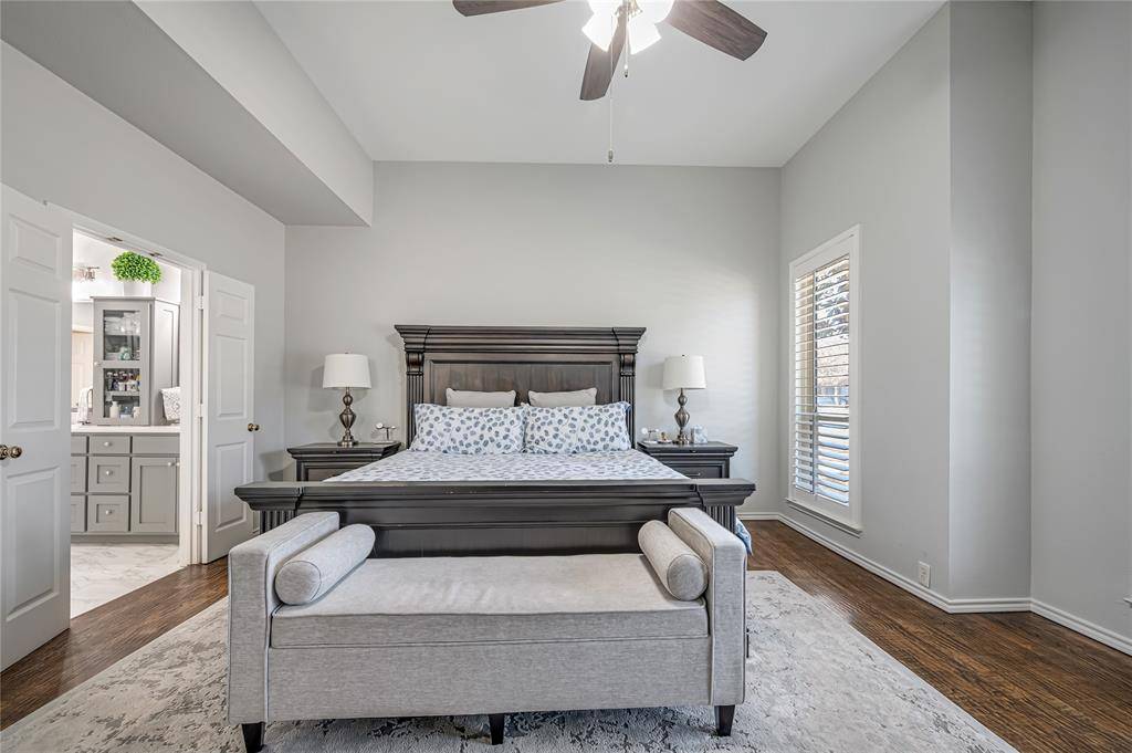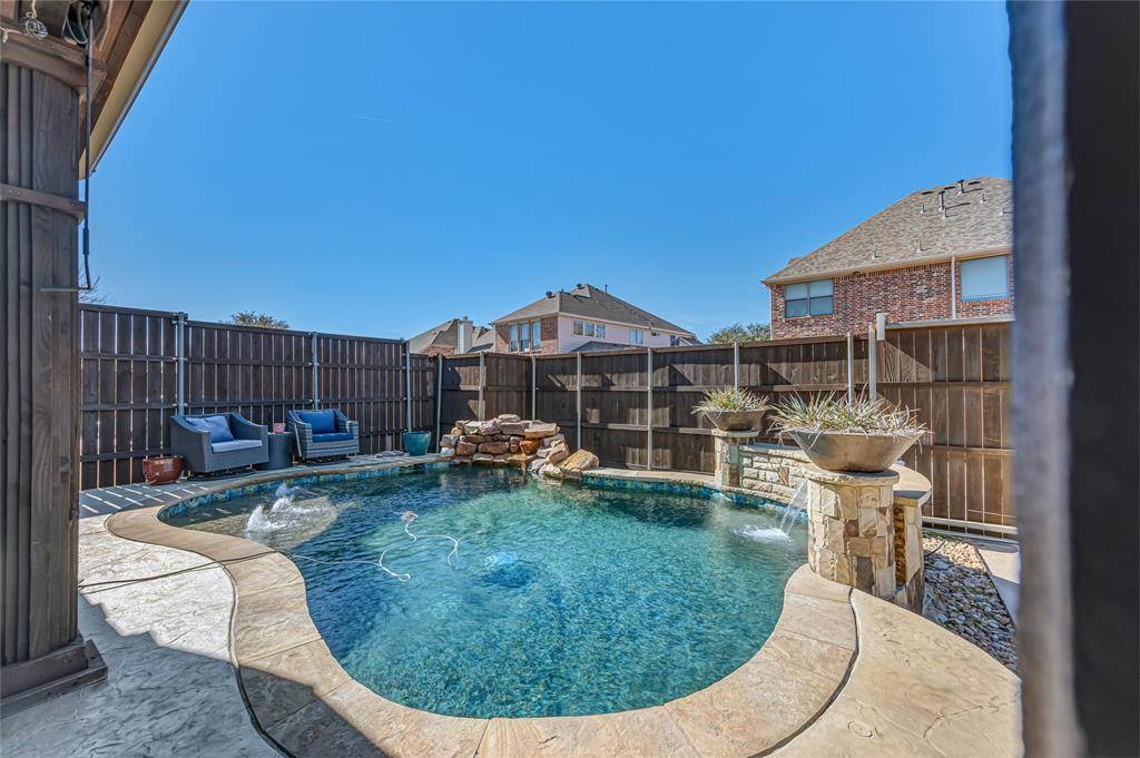 Welcome to luxury living in the highly sought-after Fairways community of Frisco! This stunning residence perfectly blends sophisticated design with everyday comfort, offering an exceptional lifestyle in a premier golf course neighborhood. Step inside to find an expansive open floorplan bathed in natural light, highlighted by gorgeous hardwood floors that flow seamlessly throughout the main living areas. The chef-inspired kitchen is a showstopper, featuring stainless steel appliances, sleek cabinetry and ample counter space and a layout designed for effortless entertaining. The primary suite is a true sanctuary. Relax in the spa-like primary bath, complete with high-end finishes and a deep soaking, jetted tub. The large walk-in closet provides abundant storage and organization for even the most extensive wardrobes. Need extra space? The versatile bonus flex room is perfect for a dedicated home office, a quiet library, gym or a playroom tailored to your needs. Your backyard is a private escape designed for the Texas summer. Dive into the sparkling pool, featuring elegant water features that create a serene, resort-style ambiance. Whether you're hosting a weekend BBQ or enjoying a quiet evening under the stars, this outdoor space is built for memories.