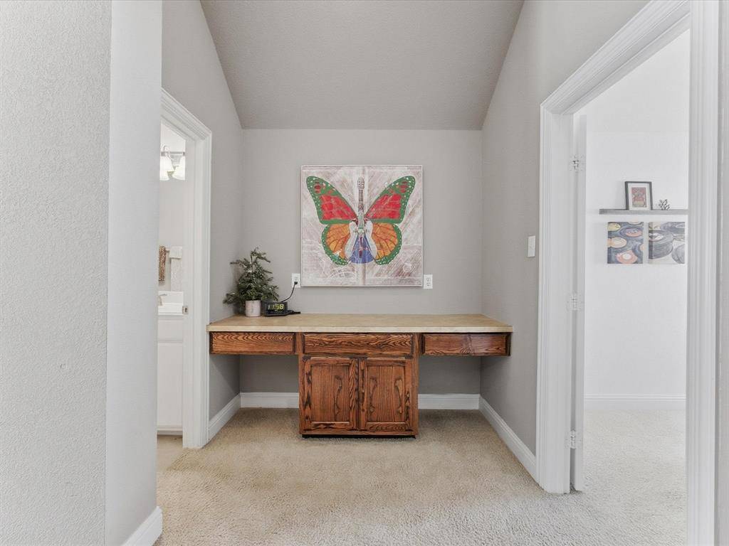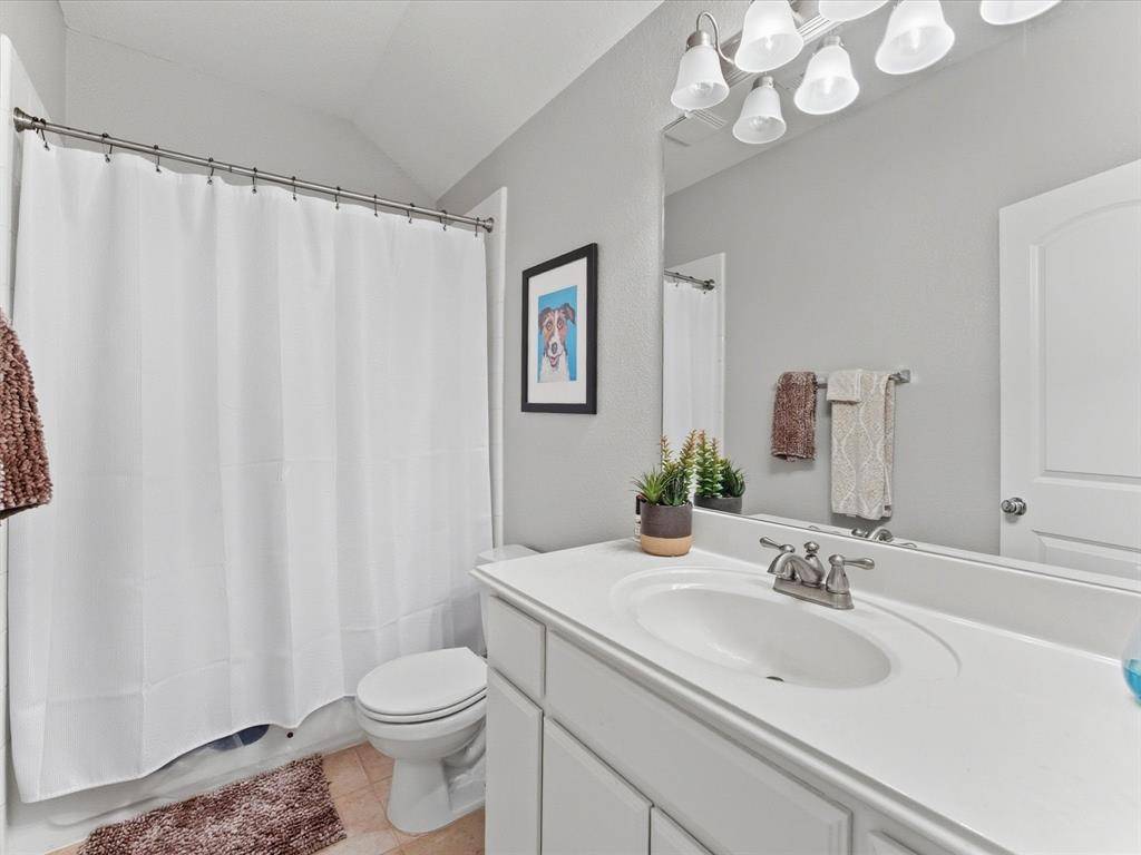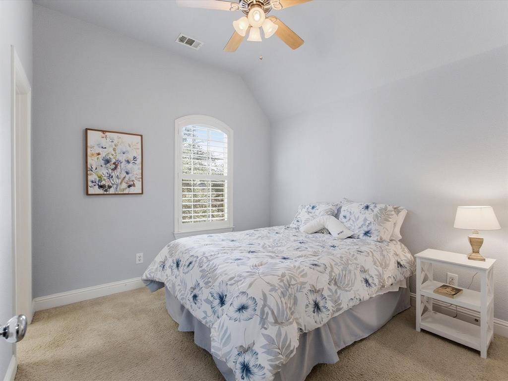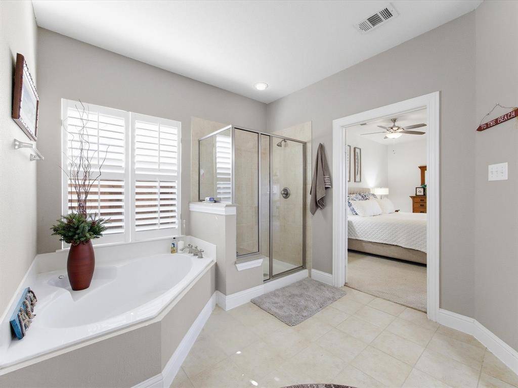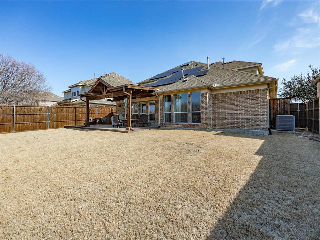 Located in sought-after Crown Ridge and zoned to Prosper ISD, 13875 Alden Lane delivers standout curb appeal with manicured landscaping and professional exterior lighting. Step inside to soaring ceilings, rich hardwood floors, a sweeping curved staircase with wrought-iron detailing, and timeless plantation shutters that set an elevated tone throughout. The chef-style kitchen is built for hosting, anchored by an oversized granite island and complemented by stainless steel appliances, a gas cooktop, and abundant cabinetry—opening seamlessly to the spacious living room with a cozy fireplace and backyard views. Extend the gathering outdoors to a private retreat featuring a covered cedar patio with ceiling fans, a stamped-concrete deck, and ambient lighting for easy year-round entertaining. The first-floor primary suite is tucked away for privacy and includes a peaceful sitting nook overlooking the backyard plus a spa-inspired bath with a garden tub, walk-in shower, dual vanities, and a custom walk-in closet with built-ins. Upstairs you'll find three generously sized bedrooms, two full baths, a huge game room, and a built-in desk area ideal for work or study. Additional perks include two fully decked attic spaces for storage, energy-saving solar panels, and a garage setup with a workbench and wall-mounted organization. Enjoy a prime Frisco location near PGA Frisco & Omni, The Star, Stonebriar Centre, Grandscape, and the planned Universal Kids Resort, with quick access to the Dallas North Tollway and Sam Rayburn Tollway (121). For a relaxed stroll or bike ride, Beaver's Bend Park offers a paved, stroller and wheelchair-friendly trail, plus access points to Frisco's broader hike-and-bike system—perfect for quick evening strolls, longer weekend loops, or cruising through city parks.