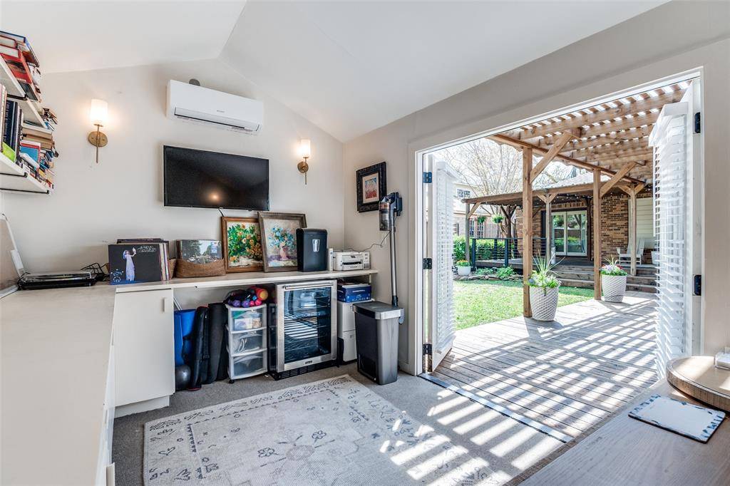 Step outside to an expansive covered deck with café lighting—an ideal setting for entertaining or unwinding. A covered walkway leads to the 200-square-foot guest quarters, complete with built-in shelving and a new mini-split system for year-round comfort.