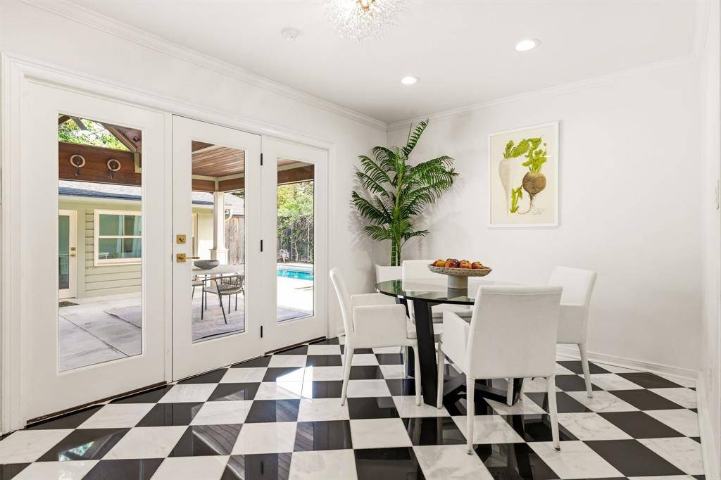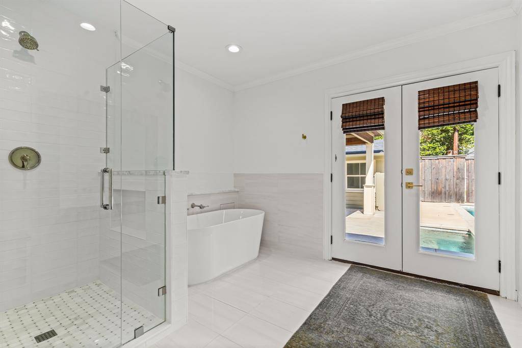 Inside, the light-filled living spaces showcase gleaming hardwood floors and plantation shutters, creating a warm and welcoming atmosphere. The updated kitchen, equipped with a Sub-Zero refrigerator, flows effortlessly into the den and master suite, both offering serene views and direct access to the outdoor entertaining area. The spacious master suite is a peaceful retreat with a cozy sitting area, an expansive walk-in closet, and a luxurious white marble bath featuring dual sinks and a separate shower.