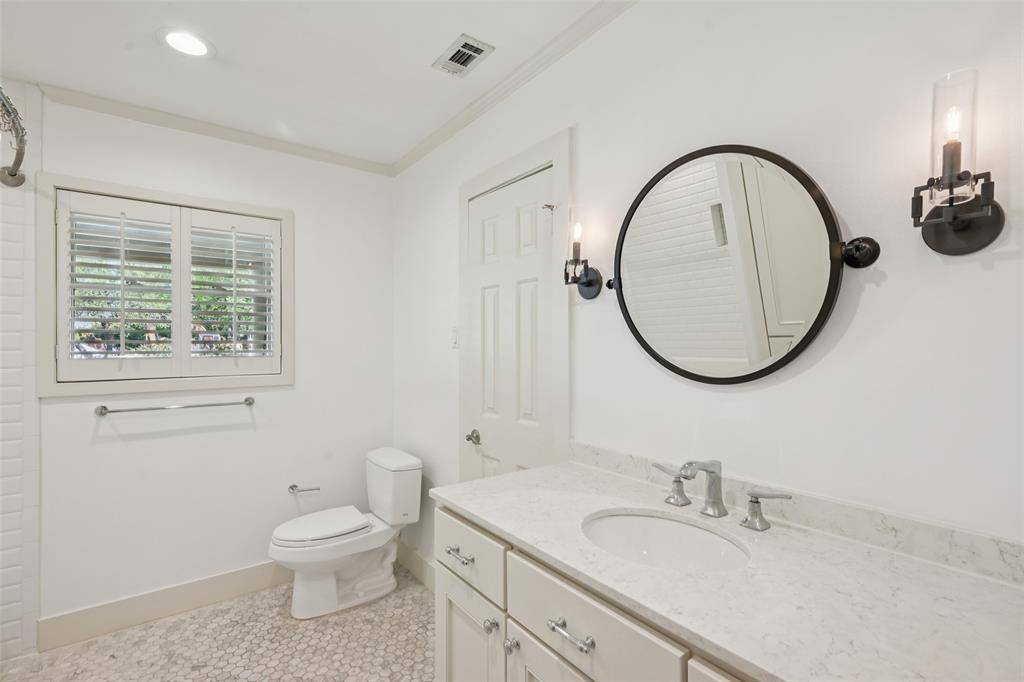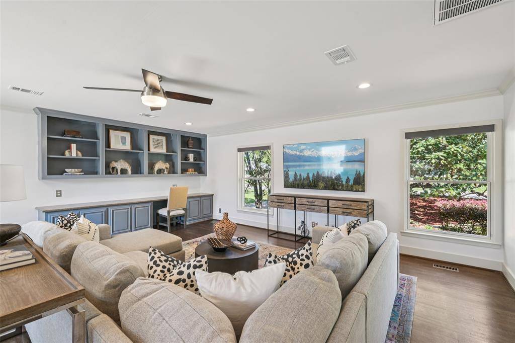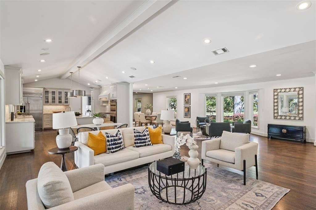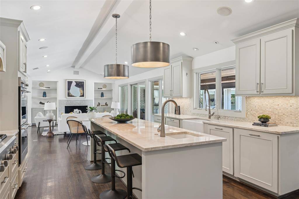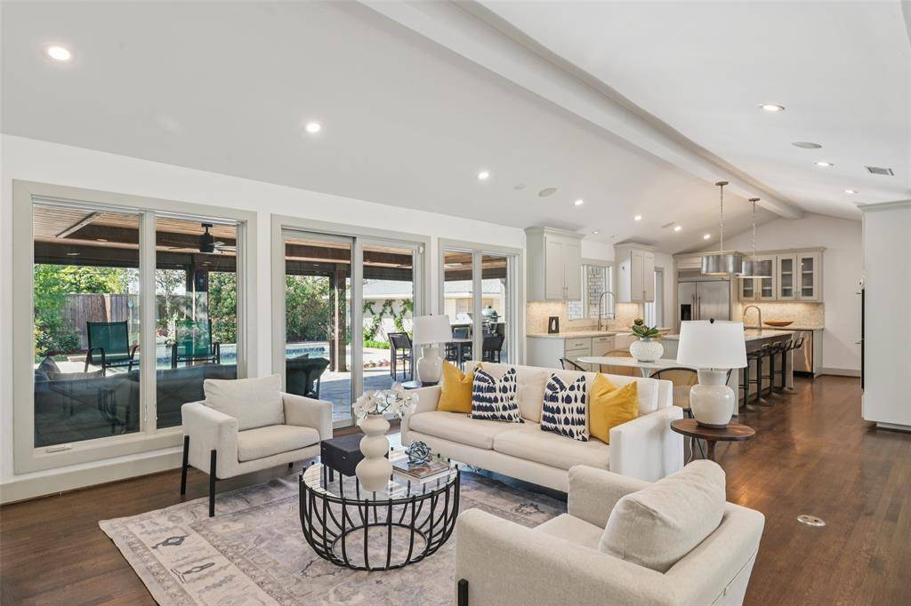 Stunning, thoughtfully designed open-concept home situated on a 120x150 foot lot in one of Dallas' most sought-after neighborhoods. Built in 1956, this single-story home offers exceptional curb appeal, multiple entertaining spaces, and over 500 square feet of covered outdoor living. Off the entry, you'll find a formal living room and an inviting family room featuring vaulted ceilings, custom built-ins, and a gas fireplace. These spaces flow seamlessly into the formal dining room and a beautifully appointed chef's kitchen. The kitchen is equipped with an expansive island, two dishwashers, built-in refrigerator, beverage refrigerator, double ovens, microwave, and an impressive walk-in pantry area with built-ins and a full-size wine refrigerator. An adjoining breakfast room completes the space. Adjacent to the kitchen is a spacious game room with built-ins and a full bath—ideal for entertaining or flexible living. The private primary suite is tucked at the rear of the home, offering serene views of the sparkling pool, plus a generous walk-in closet. The luxurious primary bath features high-end marble finishes, dual vanities, a jetted tub, and a sep shower. Two secondary bedrooms, both with walk-in closets, share a Jack-and-Jill bath, while a third bedroom enjoys access to a full, hall bath. A large utility room, complete with built-ins and a sink, rounds out the interior of this home. The backyard is an entertainer's dream, showcasing multiple seating areas, motorized screens, a built-in grill, Green Egg cooker, beverage refrigerator, TV, and a wood-burning fireplace. The outdoor living space overlooks the resort-style pool with spa and water feature, along with a generously sized turfed yard. Additional highlights include Sonos speakers in the kitchen, primary bedroom, and patio; oversized 24x27 garage with workspace and storage; a gated driveway; and exterior security cameras. Ideally located near Preston Royal shopping & dining with quick access to the Tollway.