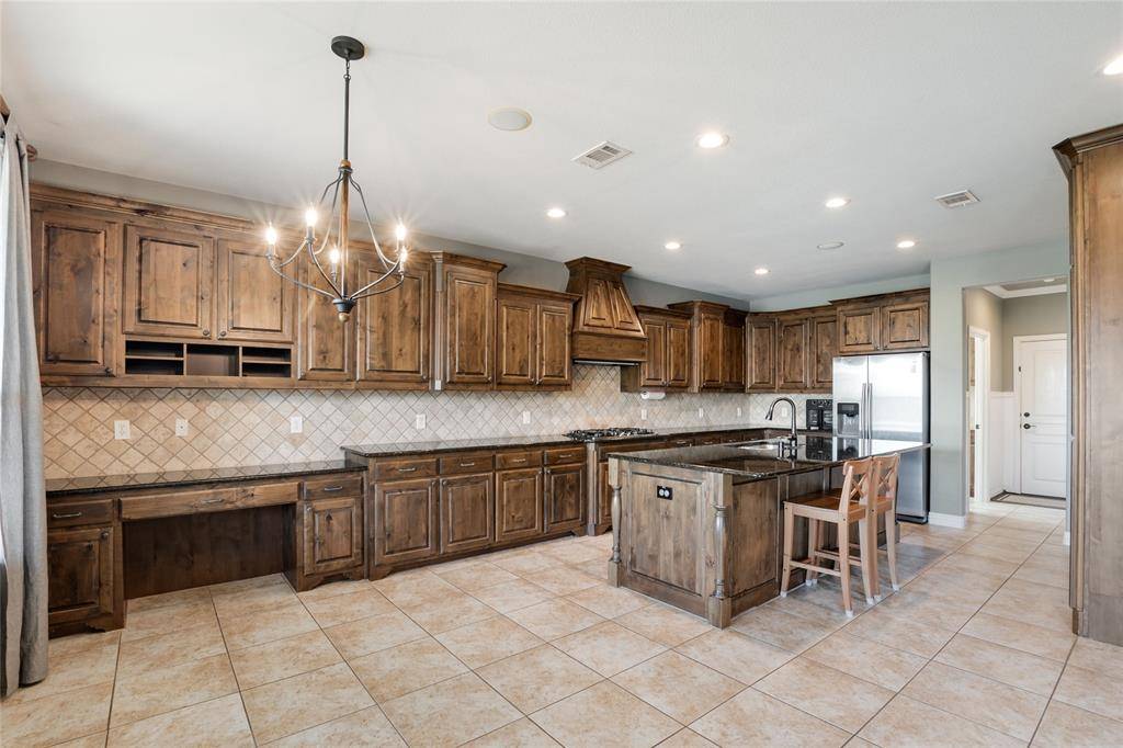 The spacious living area showcases a floor-to-ceiling stone fireplace, custom built-ins, and a beamed ceiling, seamlessly connecting to the kitchen and breakfast areas. The kitchen is equipped with a 5-burner gas cooktop, granite countertops, stainless steel appliances, large island, and ample cabinetry, along with a butler's pantry for added convenience.
