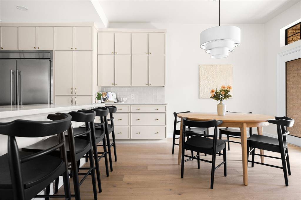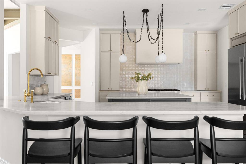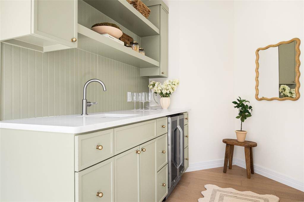 At the heart of the home is the spacious chef's kitchen, featuring custom cabinetry, stainless steel appliances, abundant storage, and a charming eat-in breakfast nook. The kitchen opens seamlessly to the family room, creating a true open-concept layout with beautiful views of the backyard pool — ideal for both entertaining and daily living. Just off the family room, a convenient wet bar enhances the entertaining experience and provides easy access to the outdoor living area.