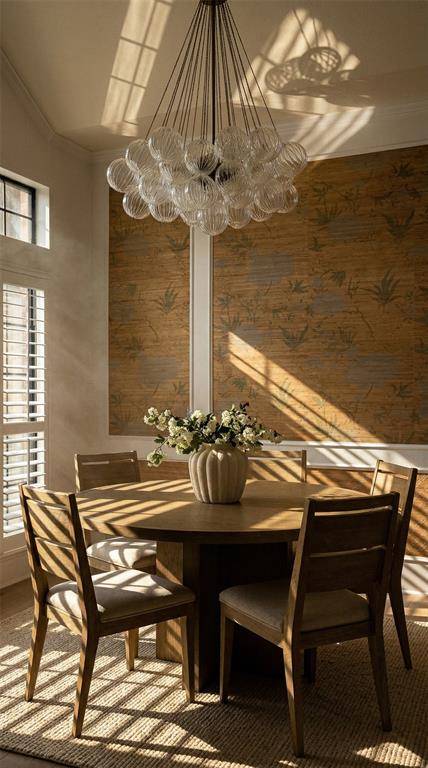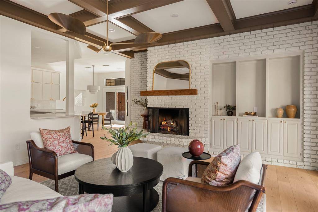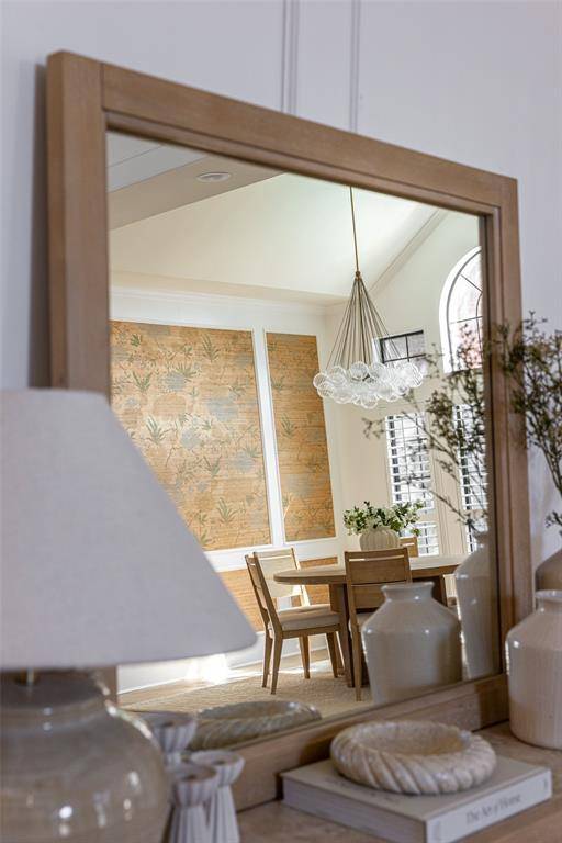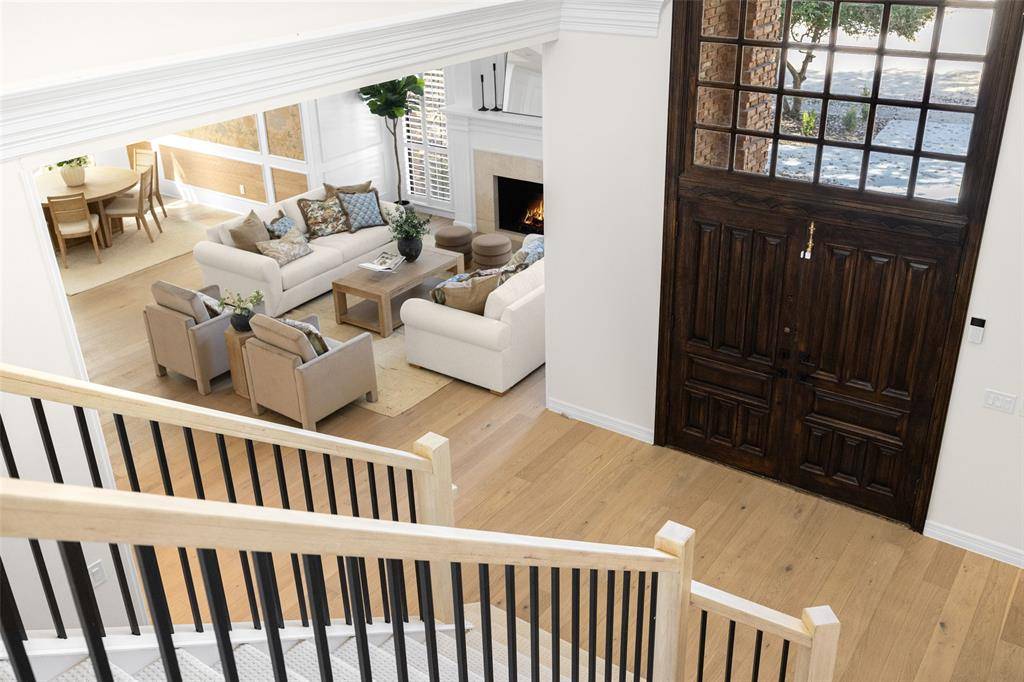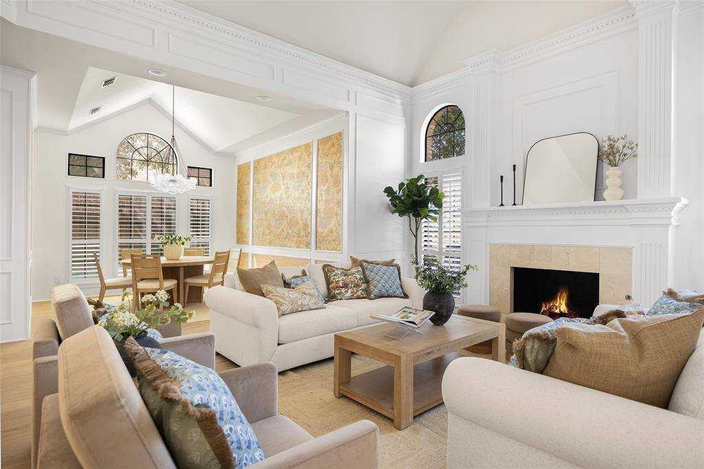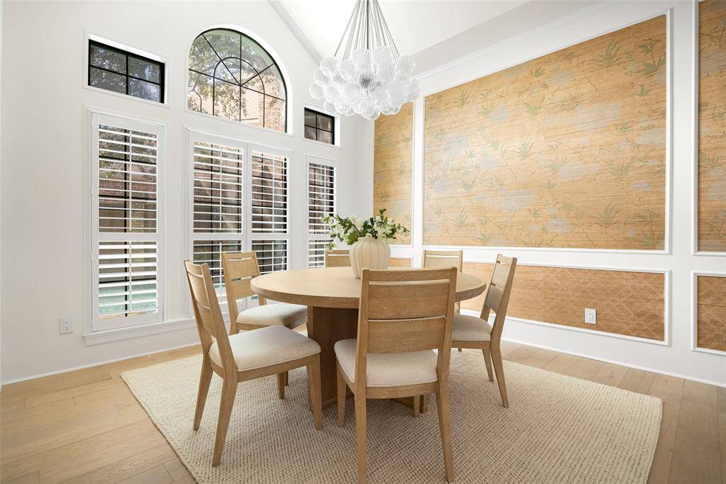 A grand staircase welcomes you into the impressive two-story foyer, creating a striking first impression upon entry. The main level features two expansive living areas, each complete with a cozy gas fireplace, providing inviting spaces for both everyday living and effortless entertaining. The elegant formal dining room showcases designer wallpaper and a statement chandelier, offering the perfect setting for memorable gatherings.