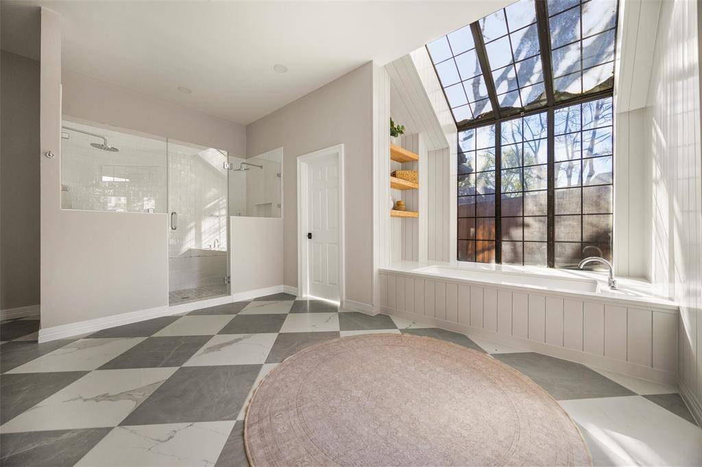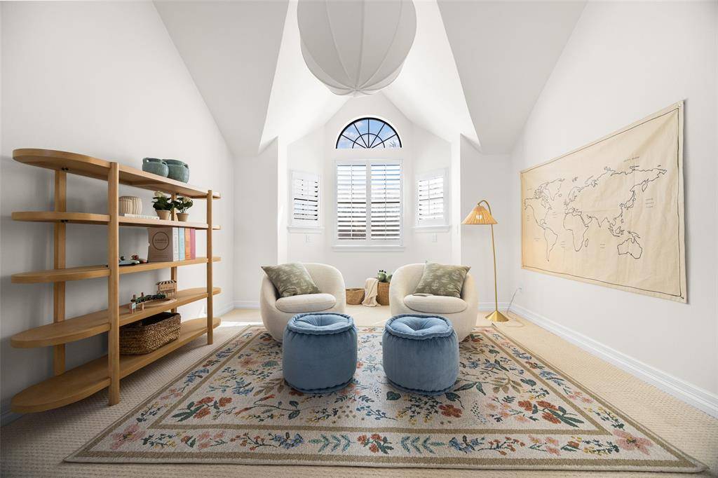 The primary suite, located on the first floor, serves as a private retreat with vaulted ceilings, a comfortable sitting area, and a large walk-in closet. The spa-inspired ensuite bathroom features dual vanities, a soaking tub, and an oversized double shower.