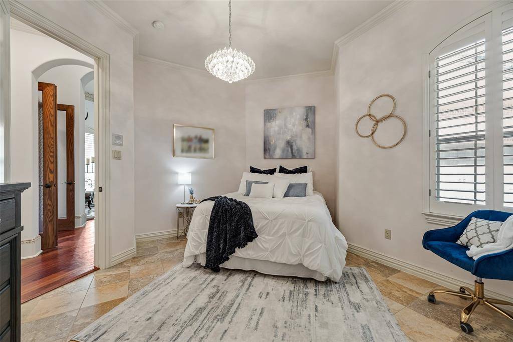 The primary suite is a private retreat, offering a fully renovated bath with freestanding soaking tub, oversized walk-in shower, and an expansive custom-designed closet with boutique-style built-ins and display space.