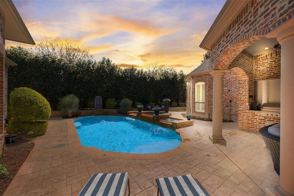 Step outside into your private backyard oasis featuring a sparkling pool, spa, water features, and an expansive covered outdoor living space with built-in grill and TV—ideal for year-round entertaining.
